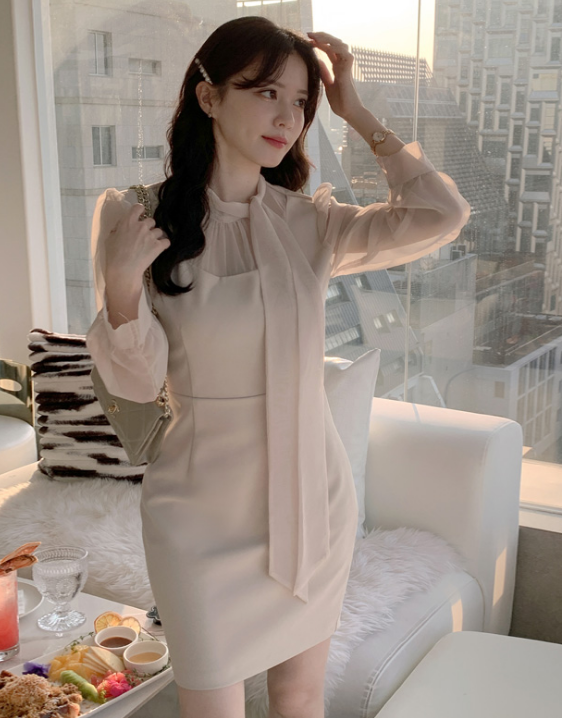 우아함&고급스러운 머메이드핏 원피스 시스루한 이중소매로 고급스러운 무드 입자마자 스페셜한 느낌이 물씬 풍겨요~ S,M,L,XL,XXL