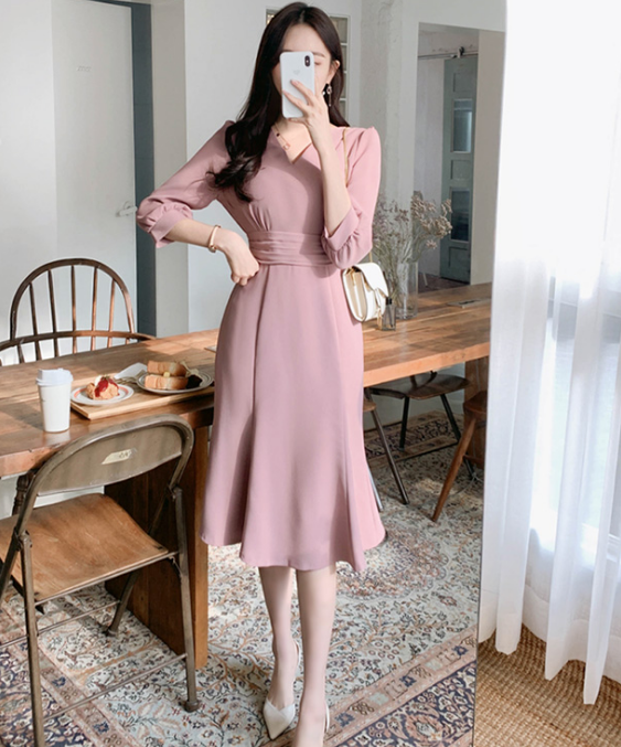 ■ 8. 허리 핀턱 뒷리본 포인트의 7부소매 하트V넥 머메이드 원피스 - 59,400원