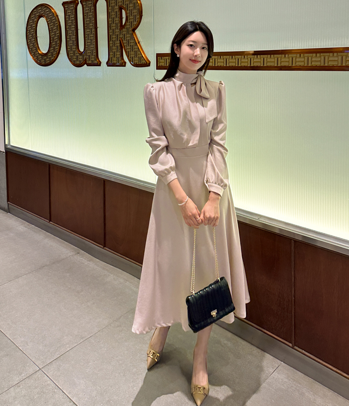 아뜨랑스,attrangs,소이,beige,SMALL,S,MEDIUM,M,키작녀,봄,가을,겨울,하이넥,원피스,미니원피스,타이원피스,리본원피스,배색원피스,쉬폰배색원피스,셔링원피스,퍼프원피스,H라인원피스,H라인미니원피