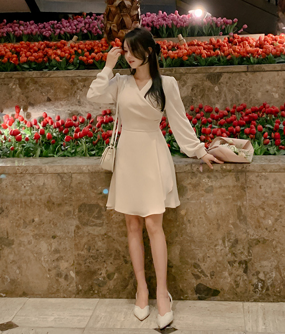 아뜨랑스,attrangs,효선,beige,무지,FREE,F,봄,가을,V넥,브이넥,원피스,미니원피스,쉬폰원피스,랩원피스,브이넥원피스,v넥원피스,드레이핑원피스,핀턱원피스,로맨틱원피스,데이트원피스,원피스추천,o